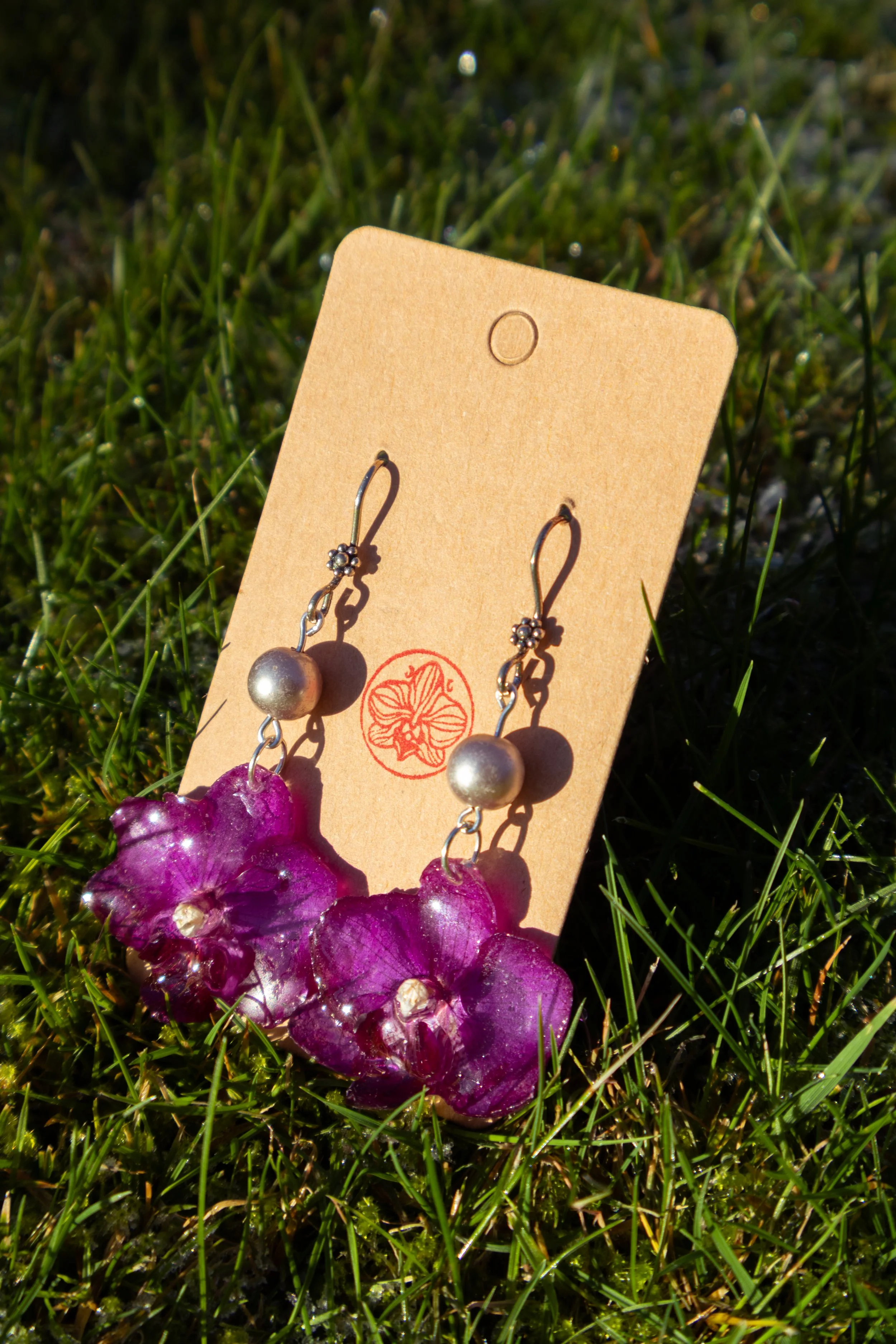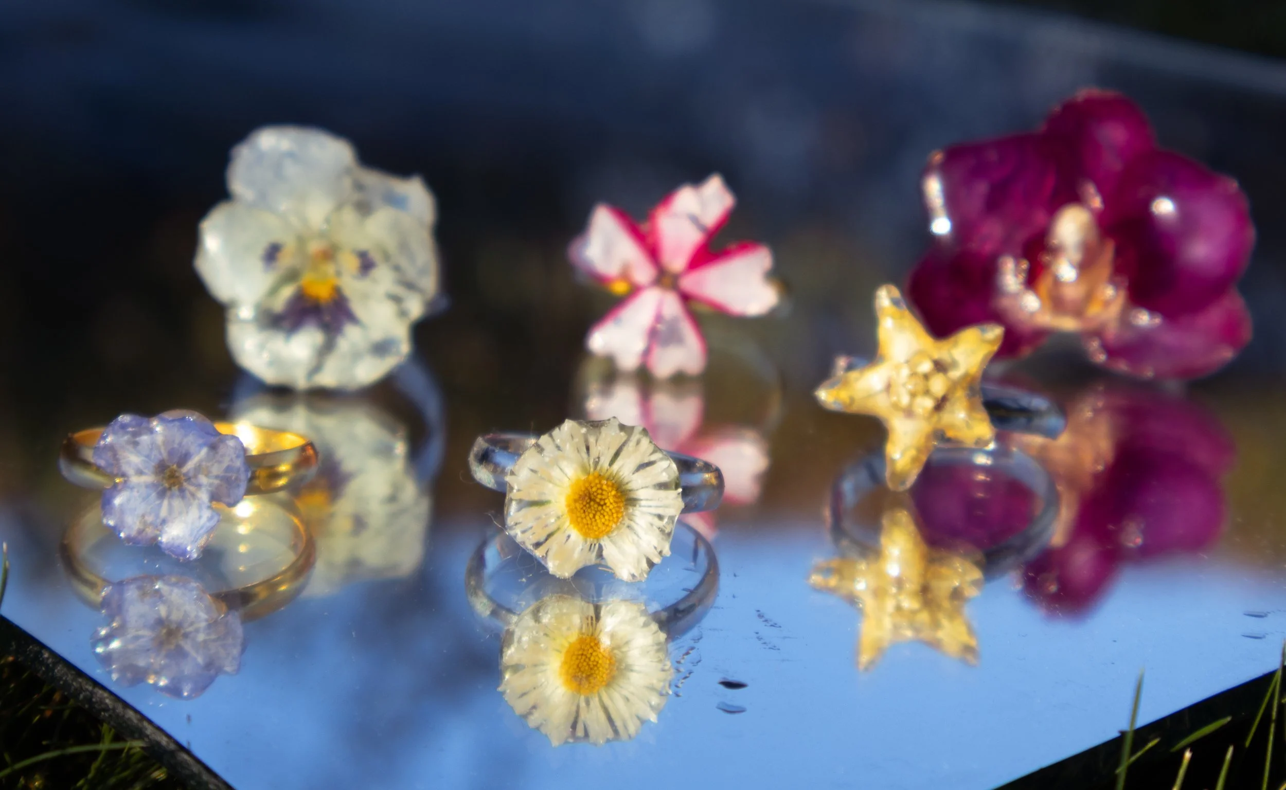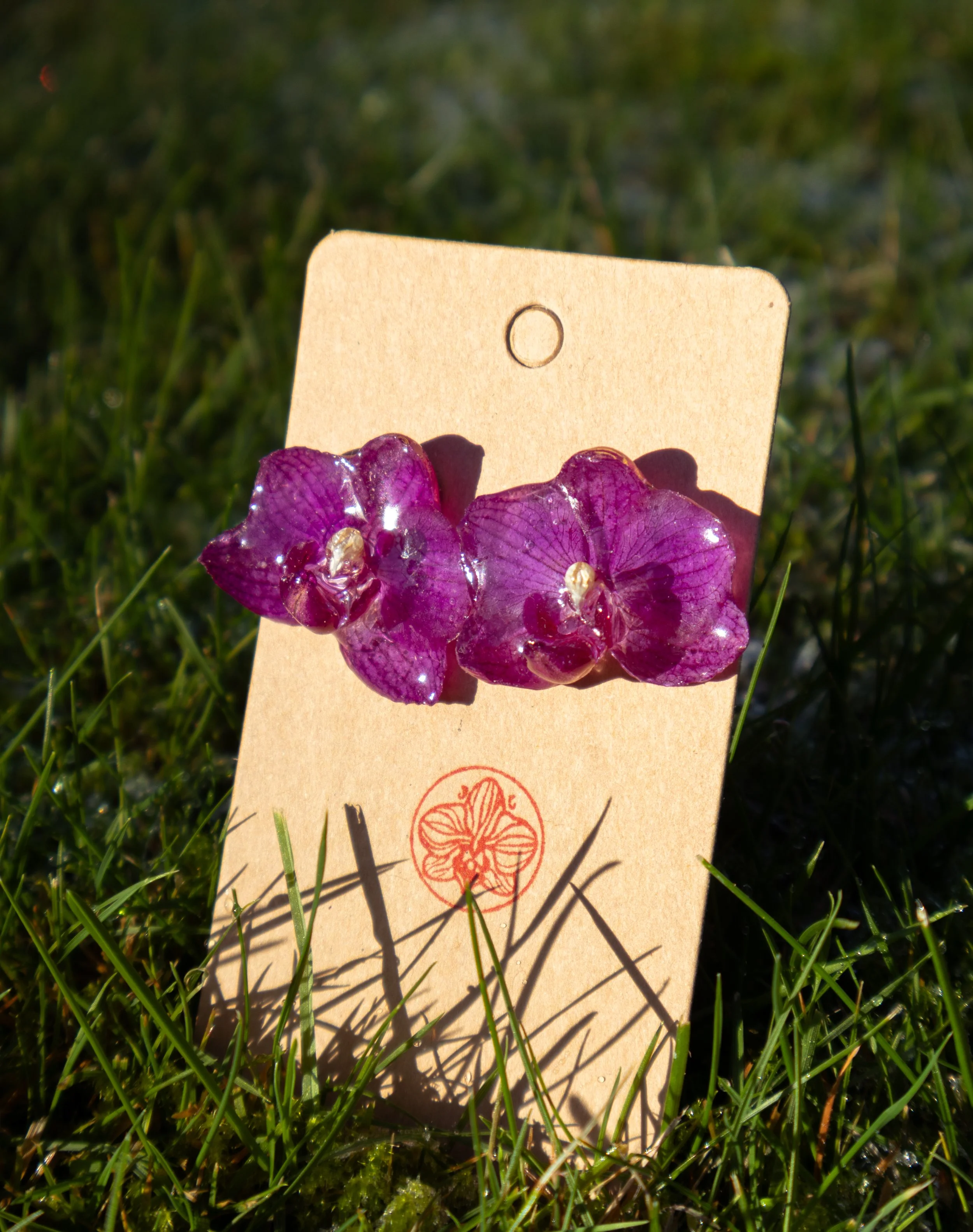 My biggest collection features delicate dried orchid flowers preserved in resin and transformed into necklaces, brooches, hair pins, earrings, rings, and keyrings. Each piece captures a little moment of nature.