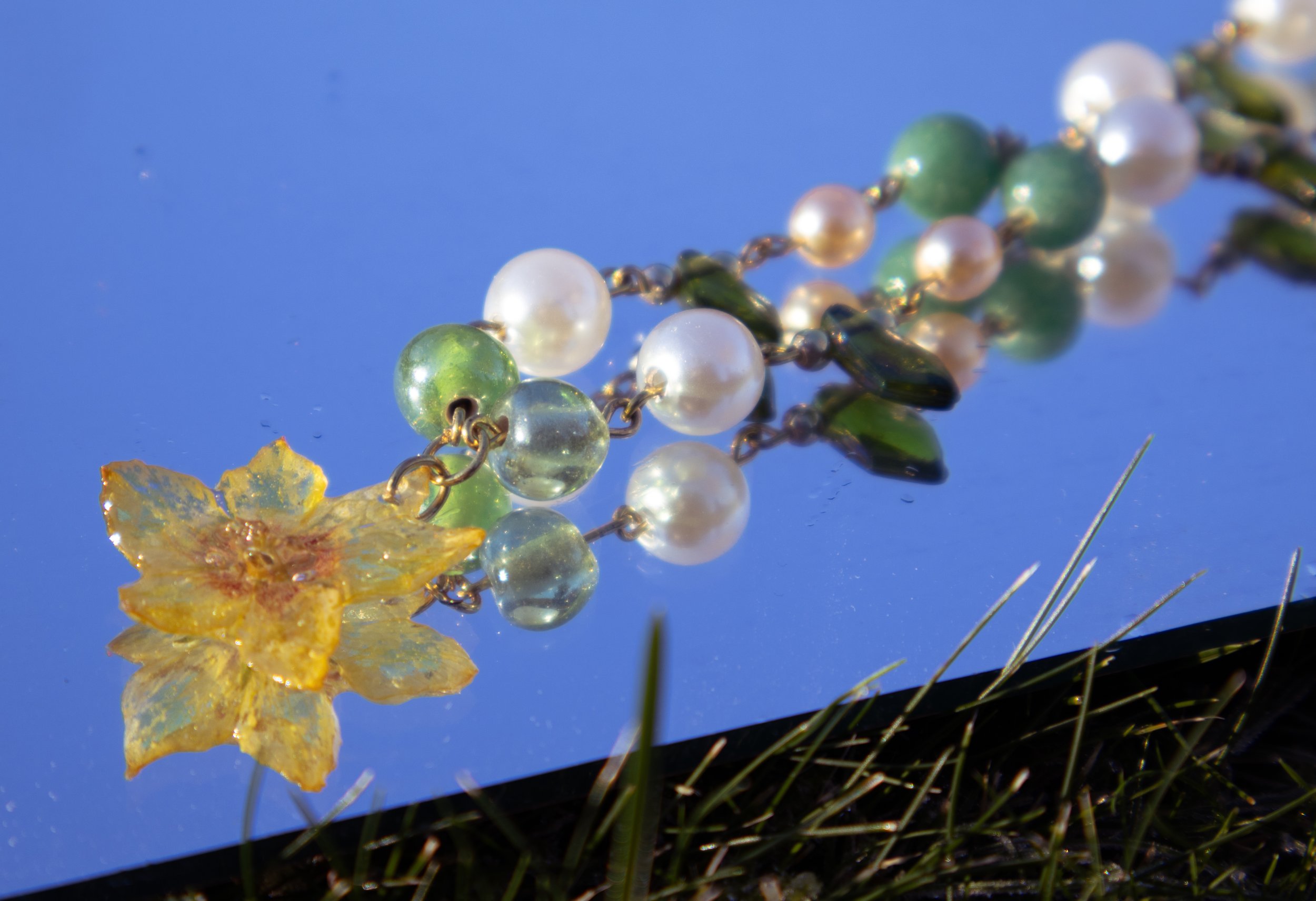 Jewelry made from second-hand beads, giving new life to forgotten accessories. Colorful, reimagined, and often carrying a hint of nature through dried flowers in resin.